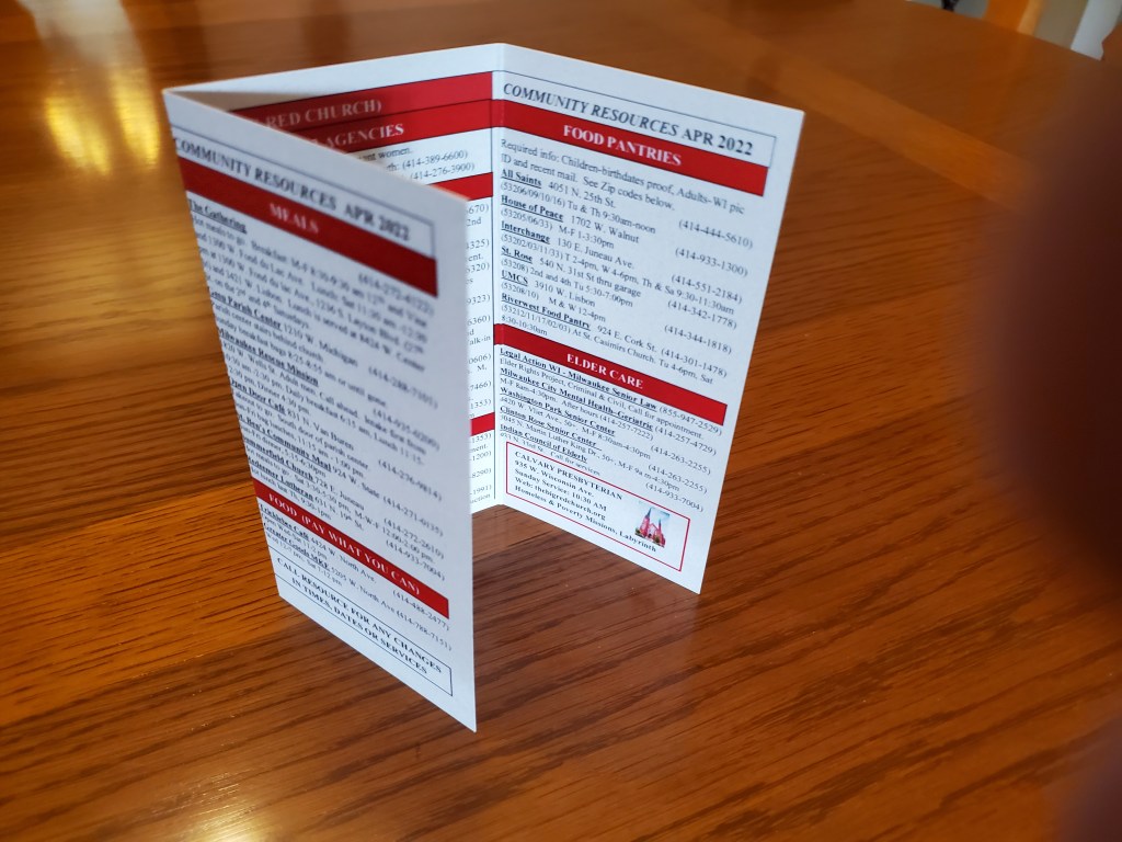 Calvary has prepared, printed and distributed a pocket-sized Community Resources card for people in need or experiencing homelessness in the central city of Milwaukee. It includes nearly 70 resources for emergency shelters, emergency hotlines, meals, food pantries, “pay what you can” food, employment, education, clothing and basic needs, healthcare, housing, W2 agencies, substance abuse help, eldercare, and advocacy. Cards are being distributed to churches, schools, shelters, clinics, food pantries, the Milwaukee Health Department, and are available in a red box at the Calvary front entrance.